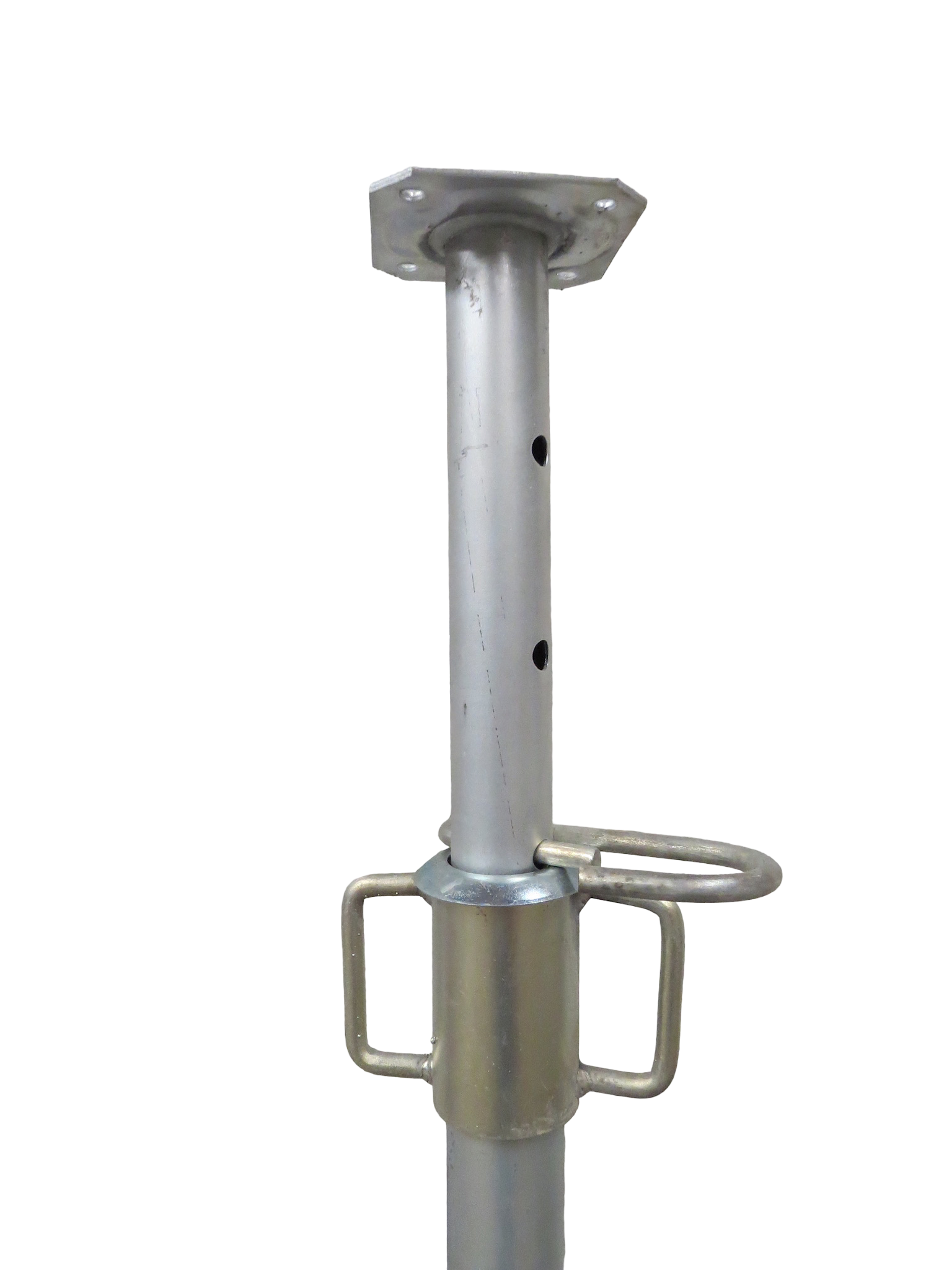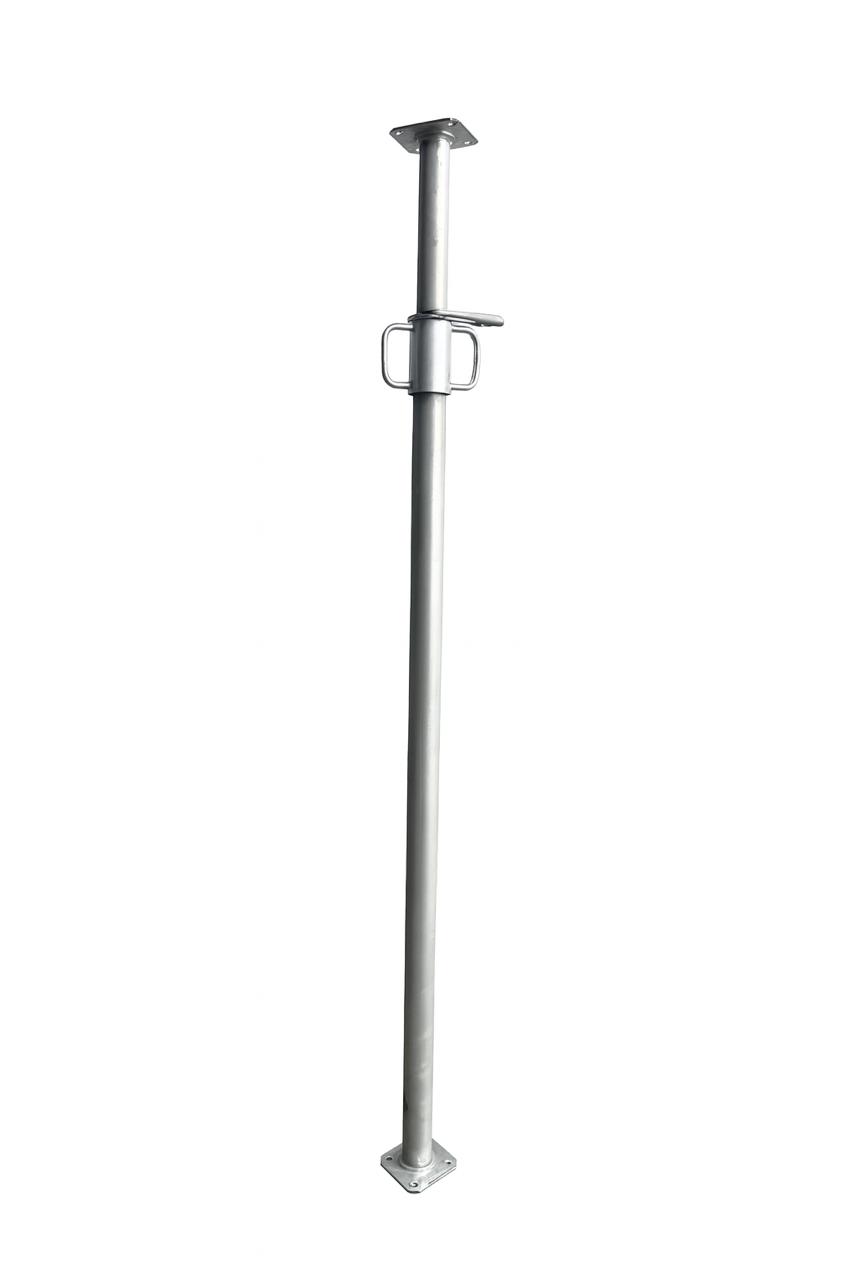 Puntal metálico galvanizado, regulable o extensible de 10 en 10 cm para cimbra de losa. Mediante el pasador y regulación fina mediante la tuerca, esto hará que el montaje y desmontaje del puntal de acero sea más rápido que el uso de puntales de madera con el consiguiente ahorro en la obra, tanto en mano de obra como en número de usos del puntal metálico frente a la made